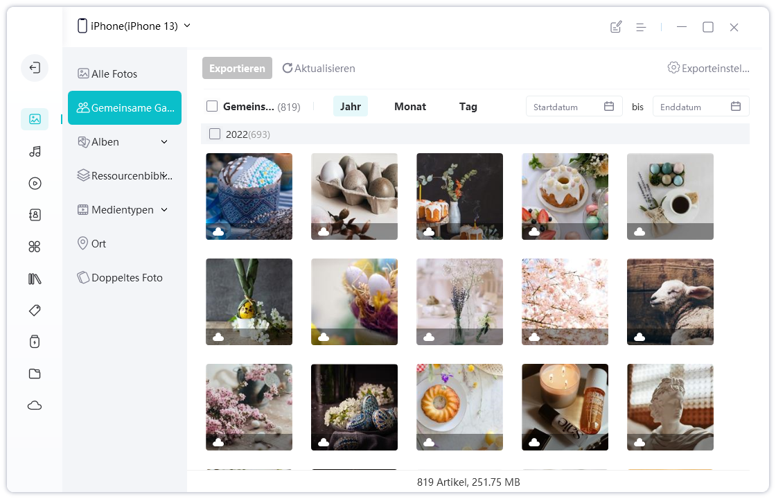 Wenn Ihr Gerät mit iOS 16 läuft und die „Gemeinsame Mediathek“ aktiviert ist, können Sie auch auf diese geteilte Mediathek in iCareFone zugreifen.