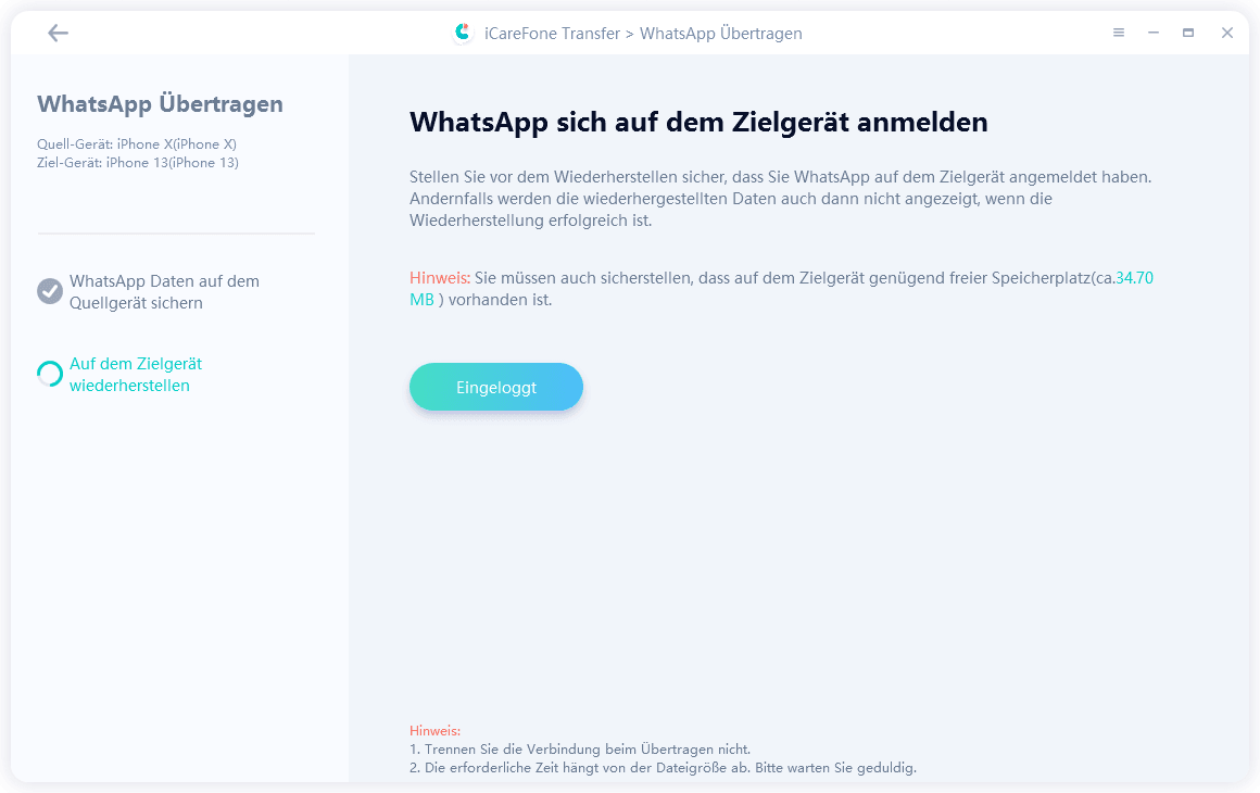 Nach Abschluss der Sicherung fordert das Programm Sie auf, sich bei WhatsApp auf dem Zielgerät anzumelden. Klicken Sie auf Eingeloggt, um fortzufahren.